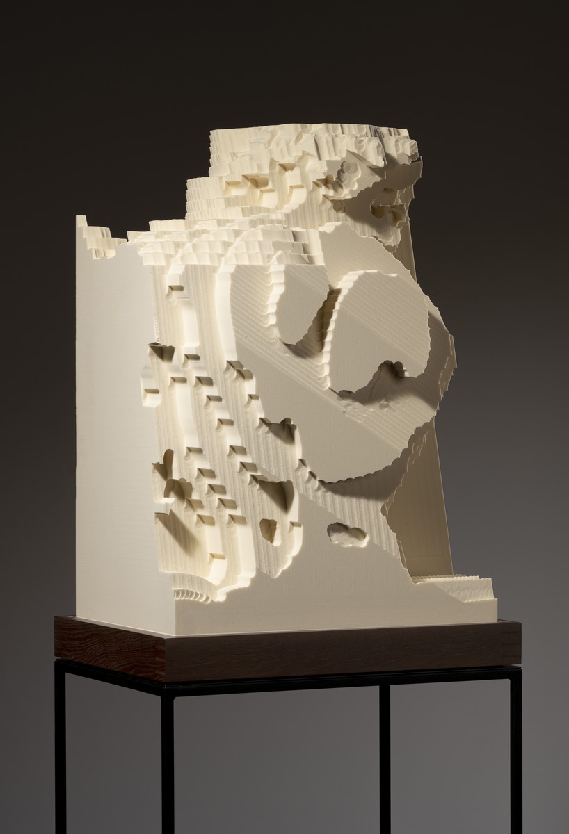 Il braccio robotico si fa strada attraverso la materia utilizzando complesse strategie computazionali. La mano dell’artista è sostituita dalla gestualità algoritmica della macchina che permette un infinito numero di possibilità praticabili.